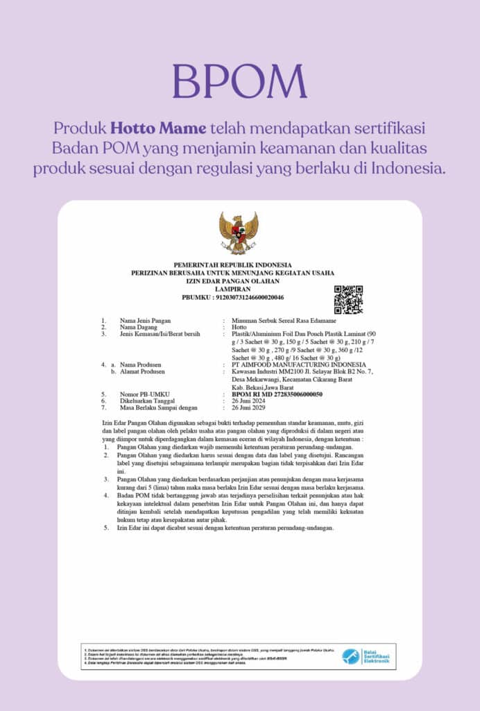 Hotto sudah memiliki sertifikasi BPOM (272835001500050) dan Halal dari Majelis Ulama Indonesia sehingga kualitas dan keamanannya sudah terjamin